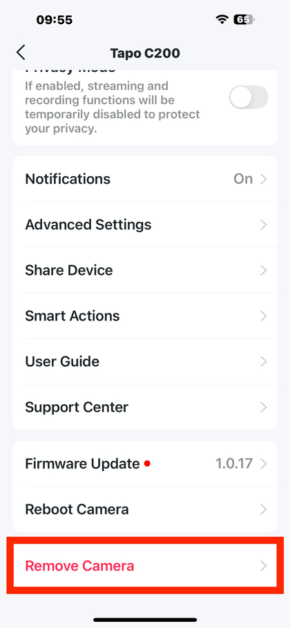 Faites défiler jusqu'au bas de la page des paramètres et sélectionnez 'Remove Camera' (Supprimer la caméra). Confirmez cette action pour réinitialiser votre caméra à ses paramètres d'usine. Après avoir effectué cette réinitialisation, vous devrez configurer votre caméra à nouveau. Ne vous inquiétez pas, nous vous guiderons à travers la configuration à nouveau sous peu.