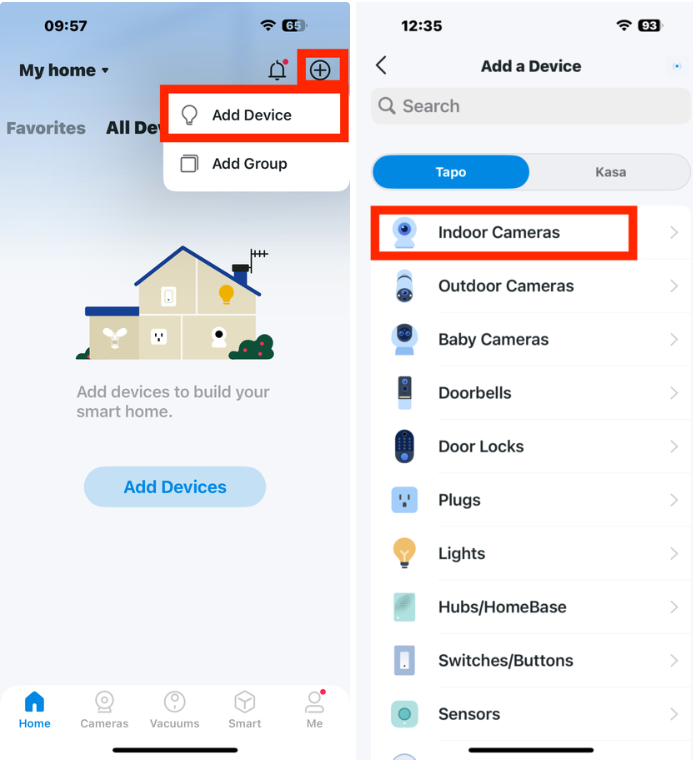 Une fois la caméra réinitialisée, revenez à l'écran principal de l'application Tapo et appuyez sur le bouton '+'. Dans Indoor Cameras (Caméras intérieures), sélectionnez Tapo C200 dans la liste des appareils disponibles. Maintenant, veuillez être patient et attendre que le voyant LED de votre caméra commence à clignoter en séquences rouge-vert. Cela indique que la caméra est prête pour une nouvelle configuration.