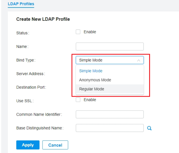 - Mode simple : les clients LDAP envoient des requêtes de liaison uniquement sans compte administrateur et mot de passe ni autorisation de requête de recherche. Ce mode est principalement utilisé pour les scénarios où les comptes d'authentification appartiennent au même nœud d'annuaire LDAP.